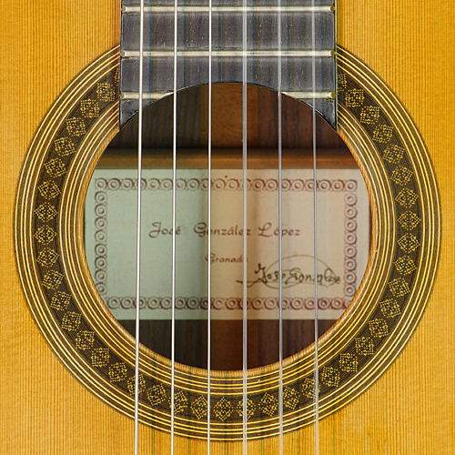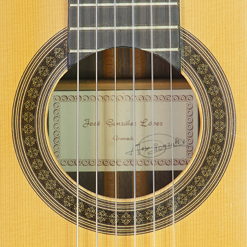 Classical guitar built by Spanish luthier José González Lopez in 2006 with spruce top and rosewood back and sides, rosette, label