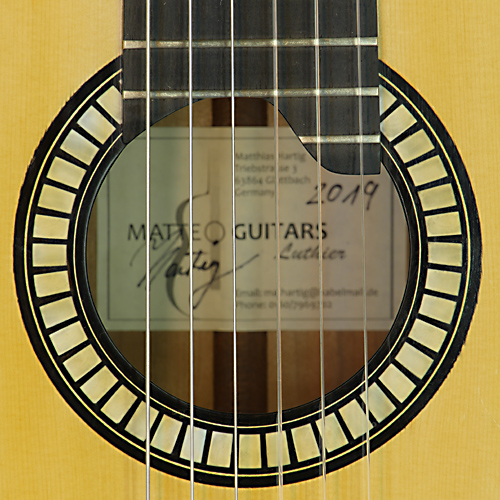 Classical guitar built by German guitar maker Matthias Hartig with cedar top and back and sides made of maple, scale 65 cm, year 2019, rosette, label