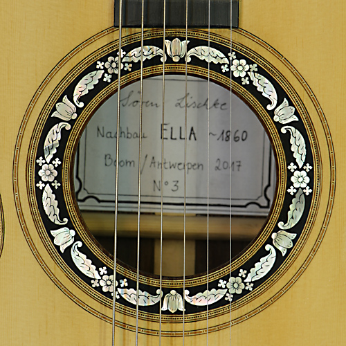 Rosette and label of classical historical guitar built by German guitar maker Sören Lischke in 2017 after guitar "Ella" (1860) with spruce top and rosewood back and sides