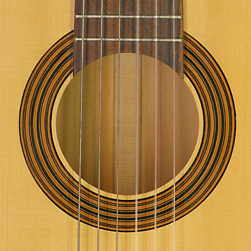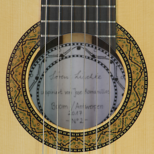 Rosette and label of classical guitar built by German guitar maker Sören Lischke in 2017 with spruce top and rosewood back and sides, scale 65 cm