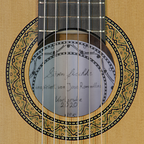 Rosette and label of classical guitar built after Antonio de Torres in 2015 by German guitar maker Sören Lischke with spruce top and cypress back and sides