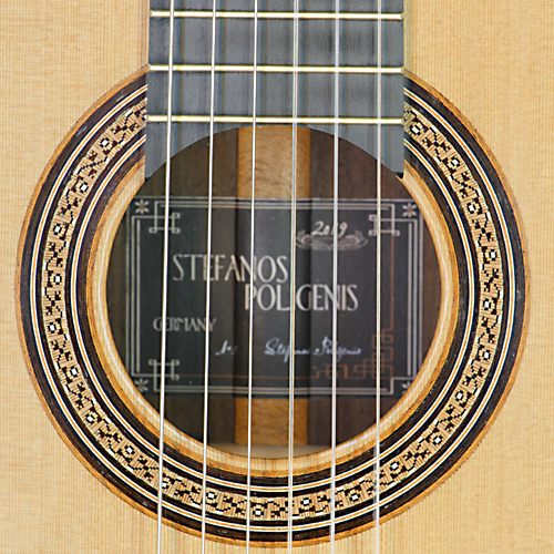 Klassische Gitarre gebaut von Stefanos Poligenis mit Zederndecke (Lattice Bracing) und Zargen und Boden aus Palisander, Baujahr 2019, Rosette, Label
