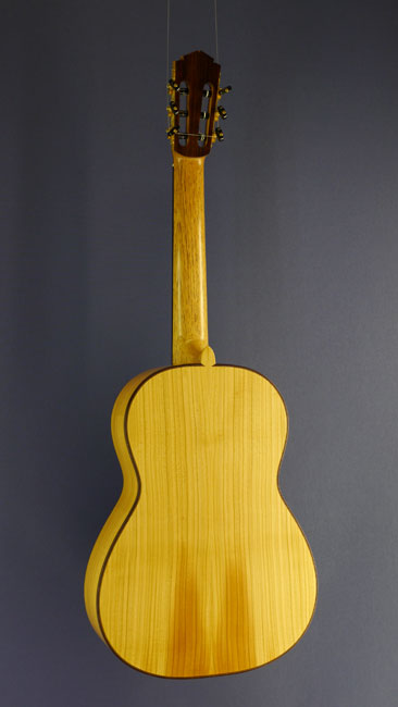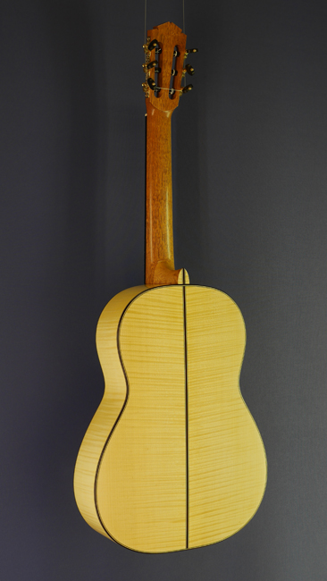Konzertgitarre gebaut von Gitarrenbauer Tobias Berg mit Fichtendecke und doppelter Zarge (innen Zypresse) und Boden aus Vogelaugenahorn, Mensur 63,5 cm, Baujahr 2019, Rückseite