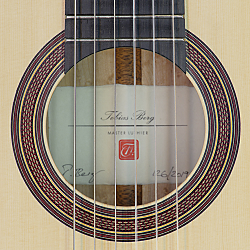 Klassische Gitarre gebaut 2016 vom Gitarrenbauer Tobias Berg mit Fichtendecke und Palisander Zargen und Boden, Rosette und Label