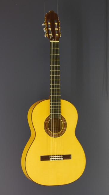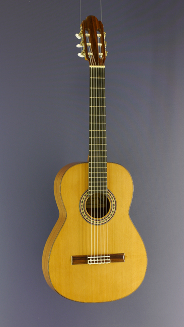 Classical guitar with solid spruce- or cedar top and rosewood on back and sides (in early years with a double rosewood back), scale 65 cm (photo with cedar top)