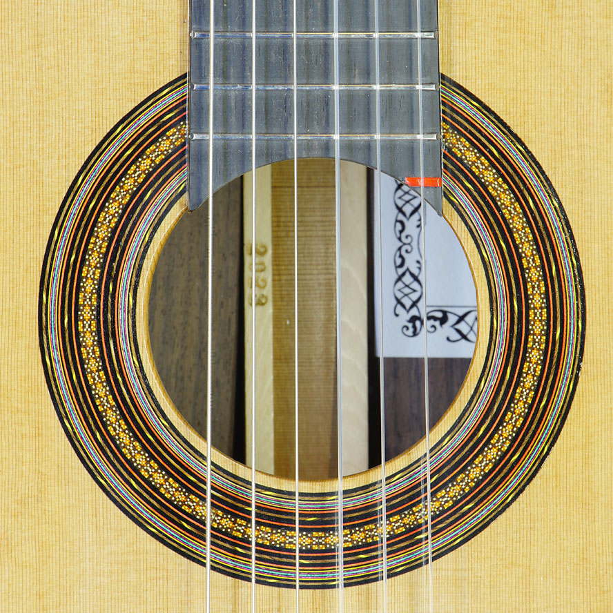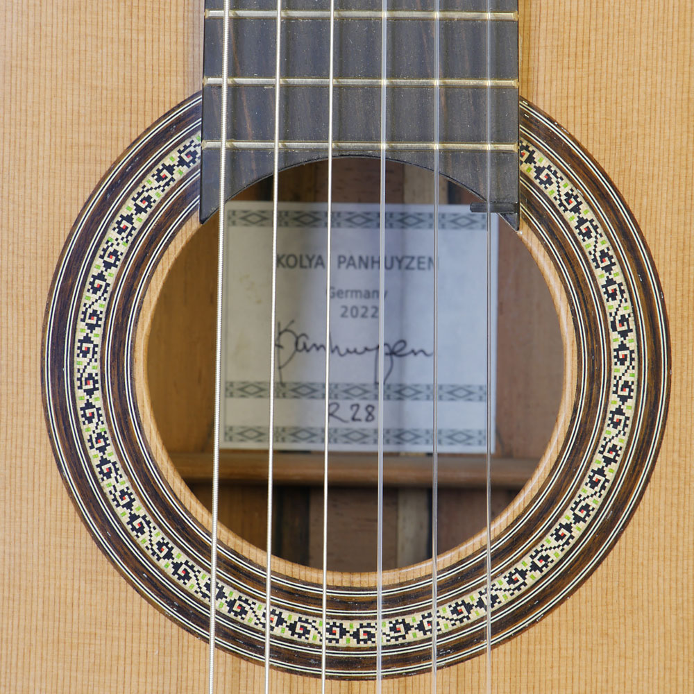Klassische Gitarre gebaut 2022 vom Gitarrenbauer Kolya Panhuyzen mit Zederndecke (Lattice Bracing) und Palisander Zargen und Boden, Rosette und Label