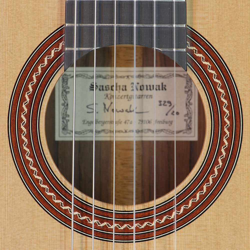 Klassische Gitarre gebaut von Gitarrenbauer Sascha Nowak mit Double Top Zeder (Balsa Lamellen) und Zargen und Boden aus Madagaskar Palisander, Rosette, Label