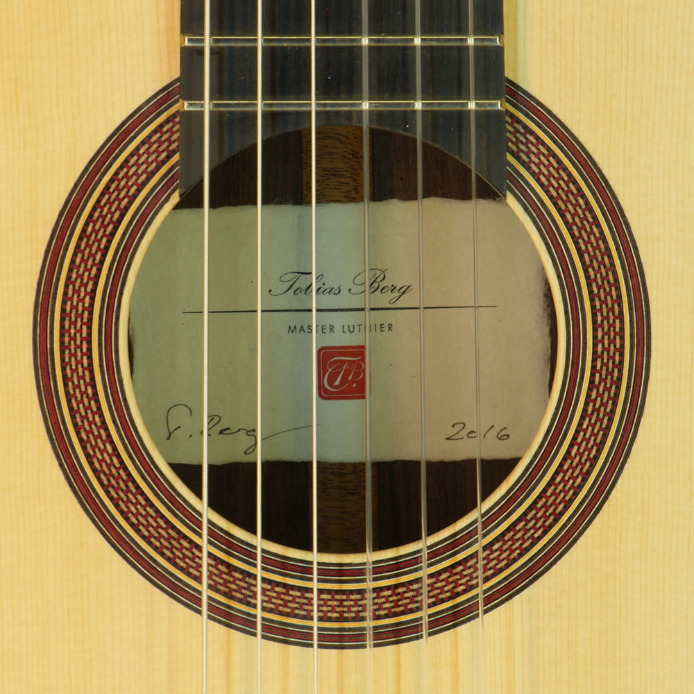 Klassische Gitarre gebaut vom Gitarrenbauer Tobias Berg mit Fichtendecke und Palisander Zargen und Boden, Rosette und Label